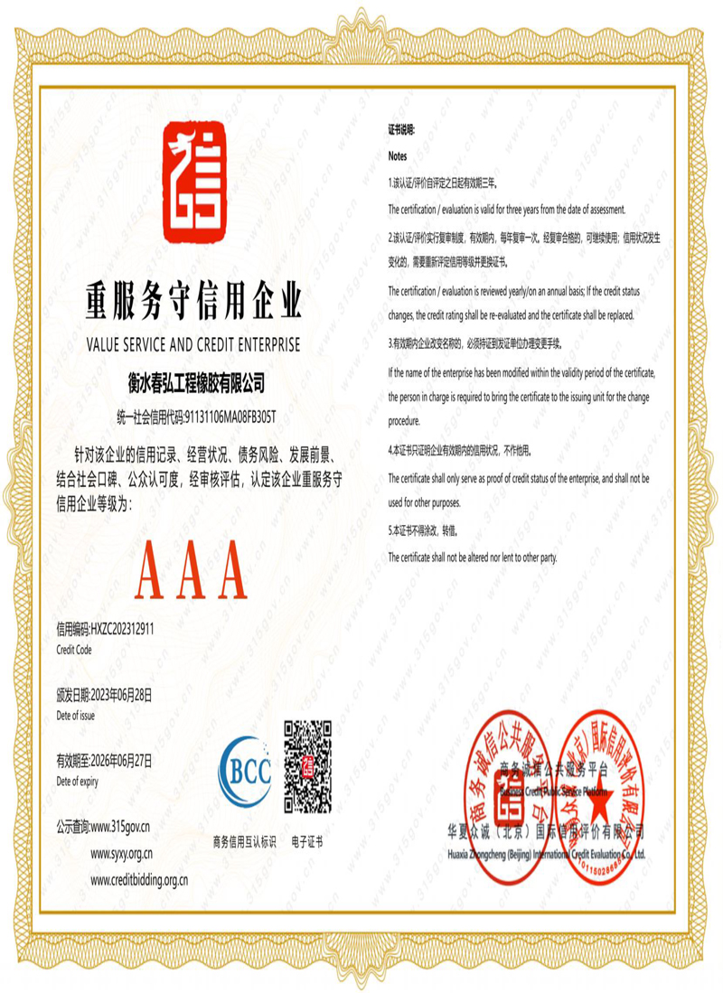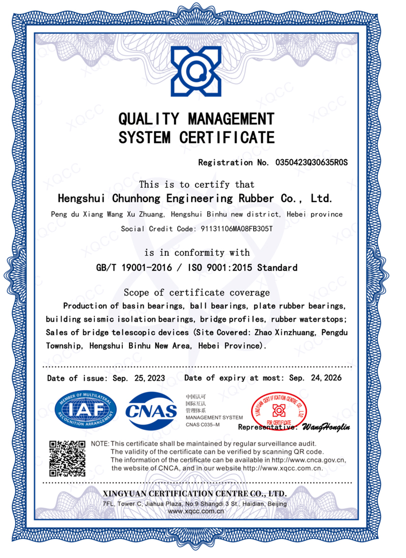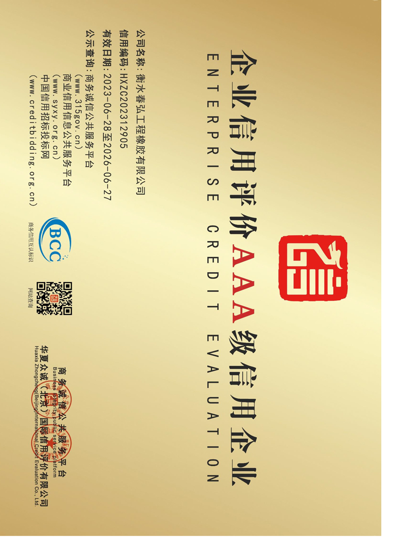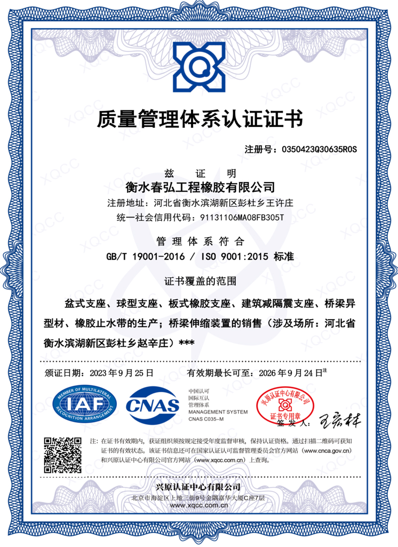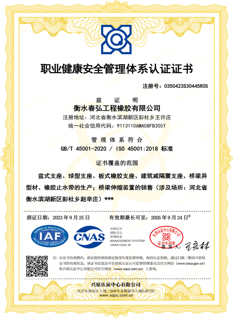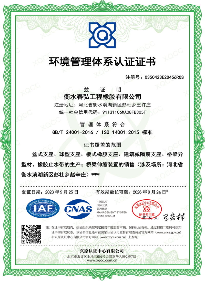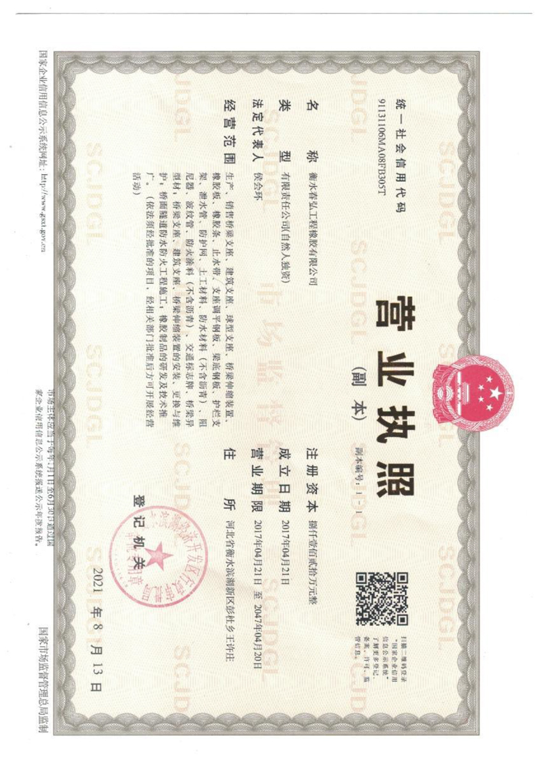 衡水春弘工程橡胶有限公司注册地址位于河北省衡水滨湖新区彭杜乡,注册机关为衡水滨湖新区市场监督管理局,法人代表为侯会环,经营范围包括生产、销售桥梁支座、建筑支座、球型支座、桥梁伸缩装置、橡胶板、橡胶条、止水带、支座调平钢板、梁底钢板、护栏支架、泄水管、防护网、土工材料、防水材料(不含沥青)、阻尼器、波纹管、防火涂料(不含沥青)、交通标志牌、桥梁异型材;桥梁支座、建筑支座、桥梁伸缩装置的安装、更换与维护;桥面隧道防水防火工程施工;橡胶制品的研发及技术推广。我们秉承“诚信为本,质量为业,对工程负责,让用户满意”为企业精神,与各界朋友协力合作,携手
