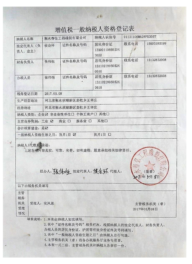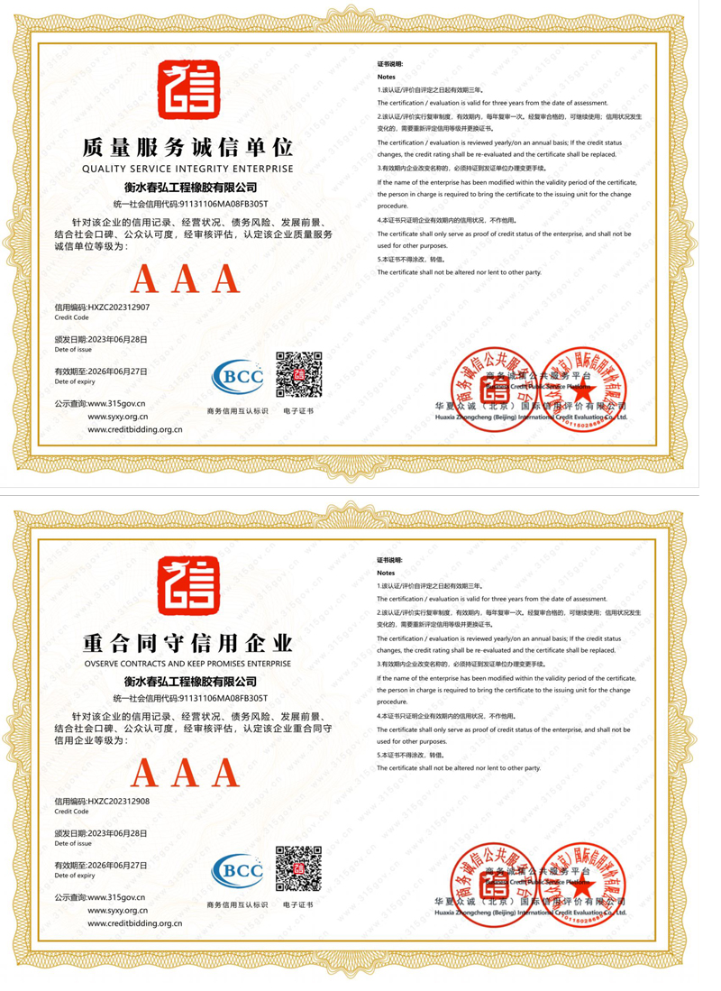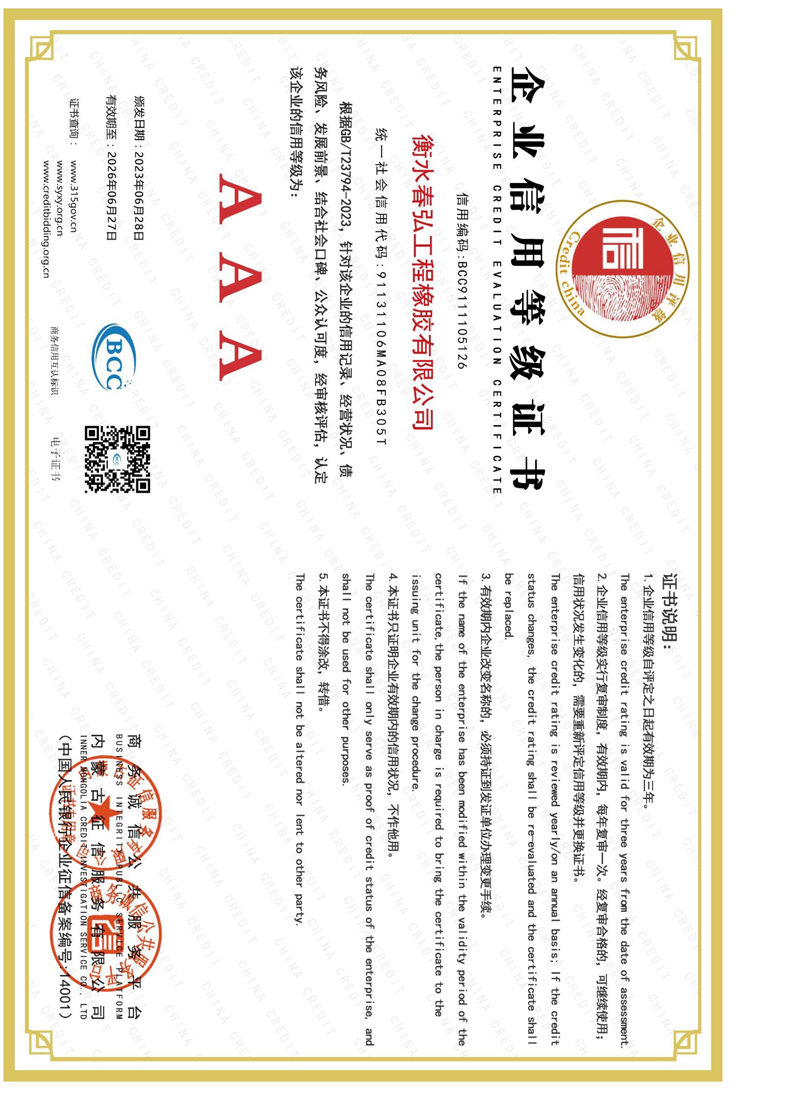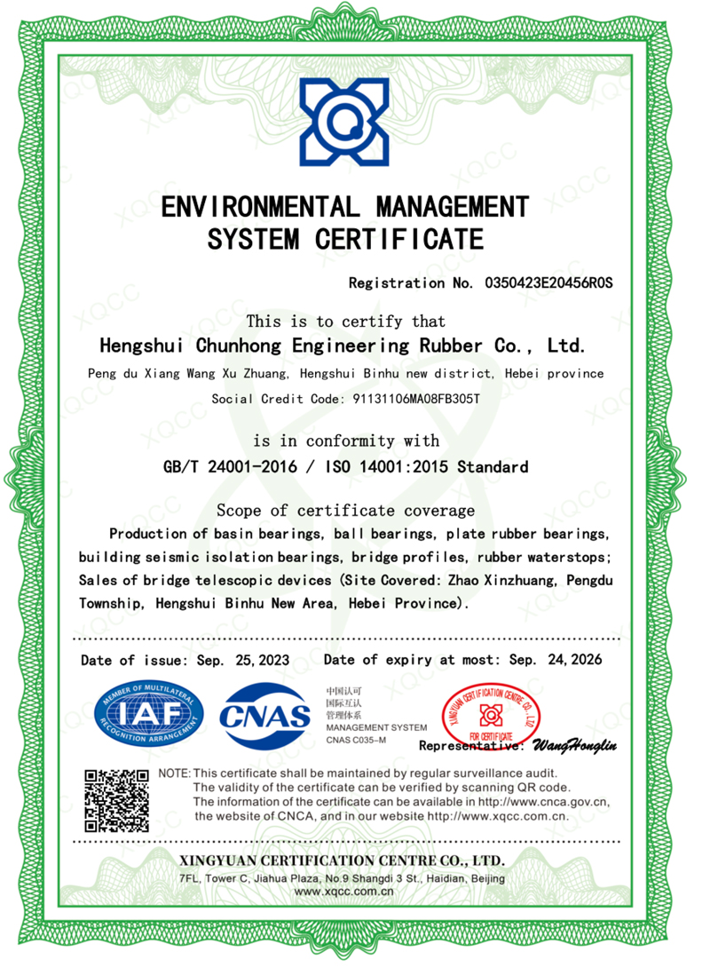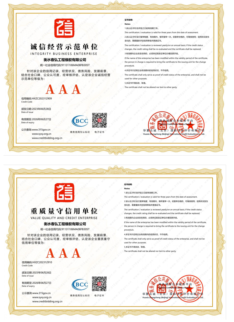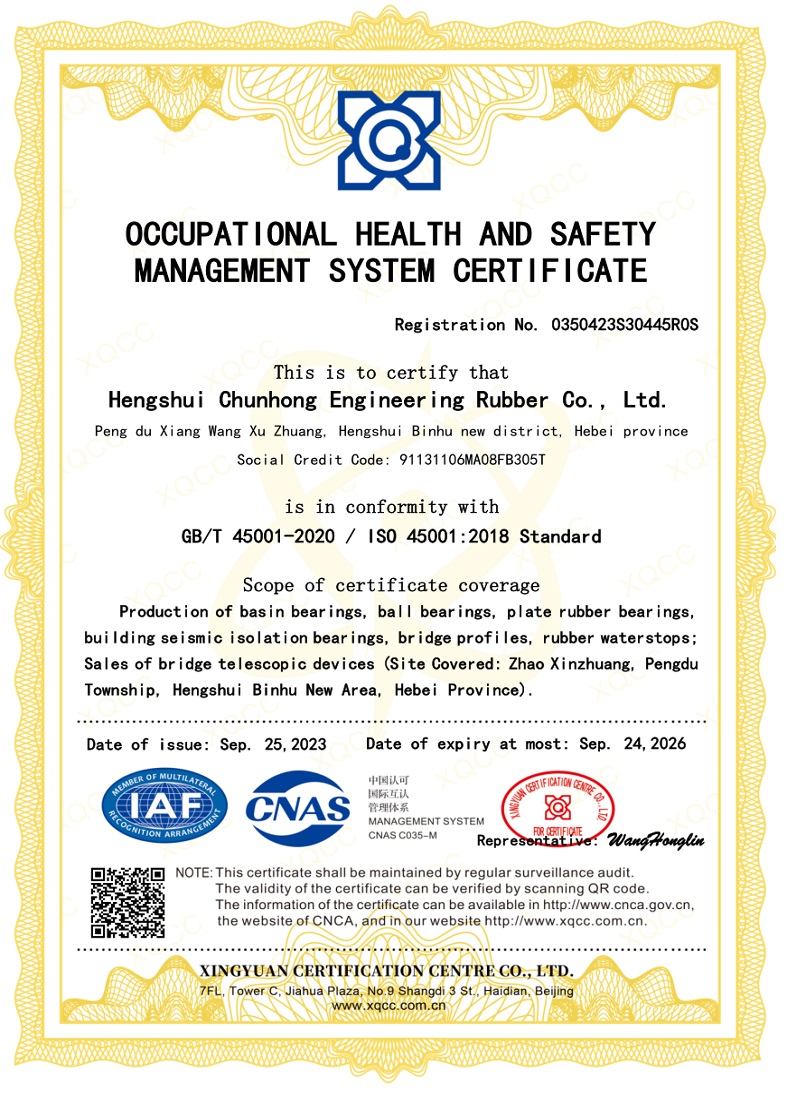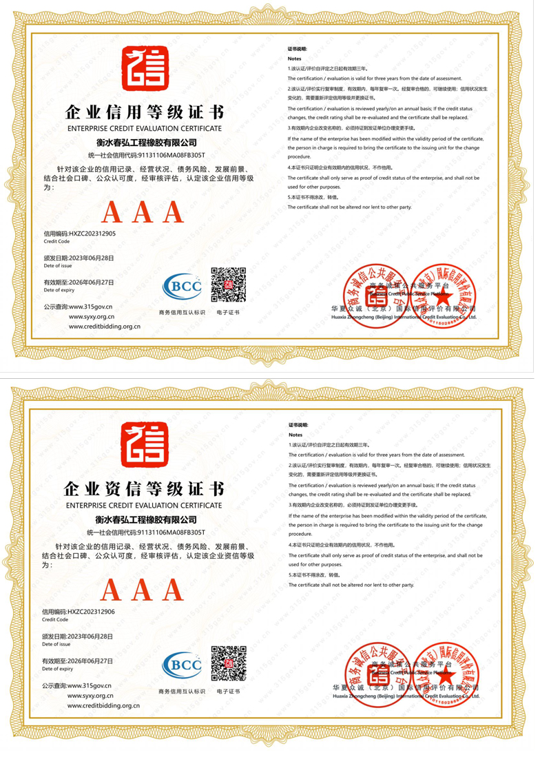 衡水春弘工程橡胶有限公司注册地址位于河北省衡水滨湖新区彭杜乡,注册机关为衡水滨湖新区市场监督管理局,法人代表为侯会环,经营范围包括生产、销售桥梁支座、建筑支座、球型支座、桥梁伸缩装置、橡胶板、橡胶条、止水带、支座调平钢板、梁底钢板、护栏支架、泄水管、防护网、土工材料、防水材料(不含沥青)、阻尼器、波纹管、防火涂料(不含沥青)、交通标志牌、桥梁异型材;桥梁支座、建筑支座、桥梁伸缩装置的安装、更换与维护;桥面隧道防水防火工程施工;橡胶制品的研发及技术推广。我们秉承“诚信为本,质量为业,对工程负责,让用户满意”为企业精神,与各界朋友协力合作,携手